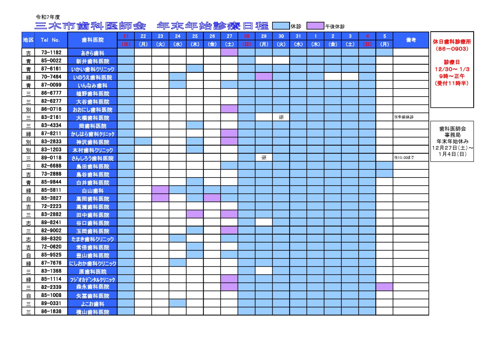 令和7年度三木市歯科医師会年末年始の診療日程表を公開致しました。