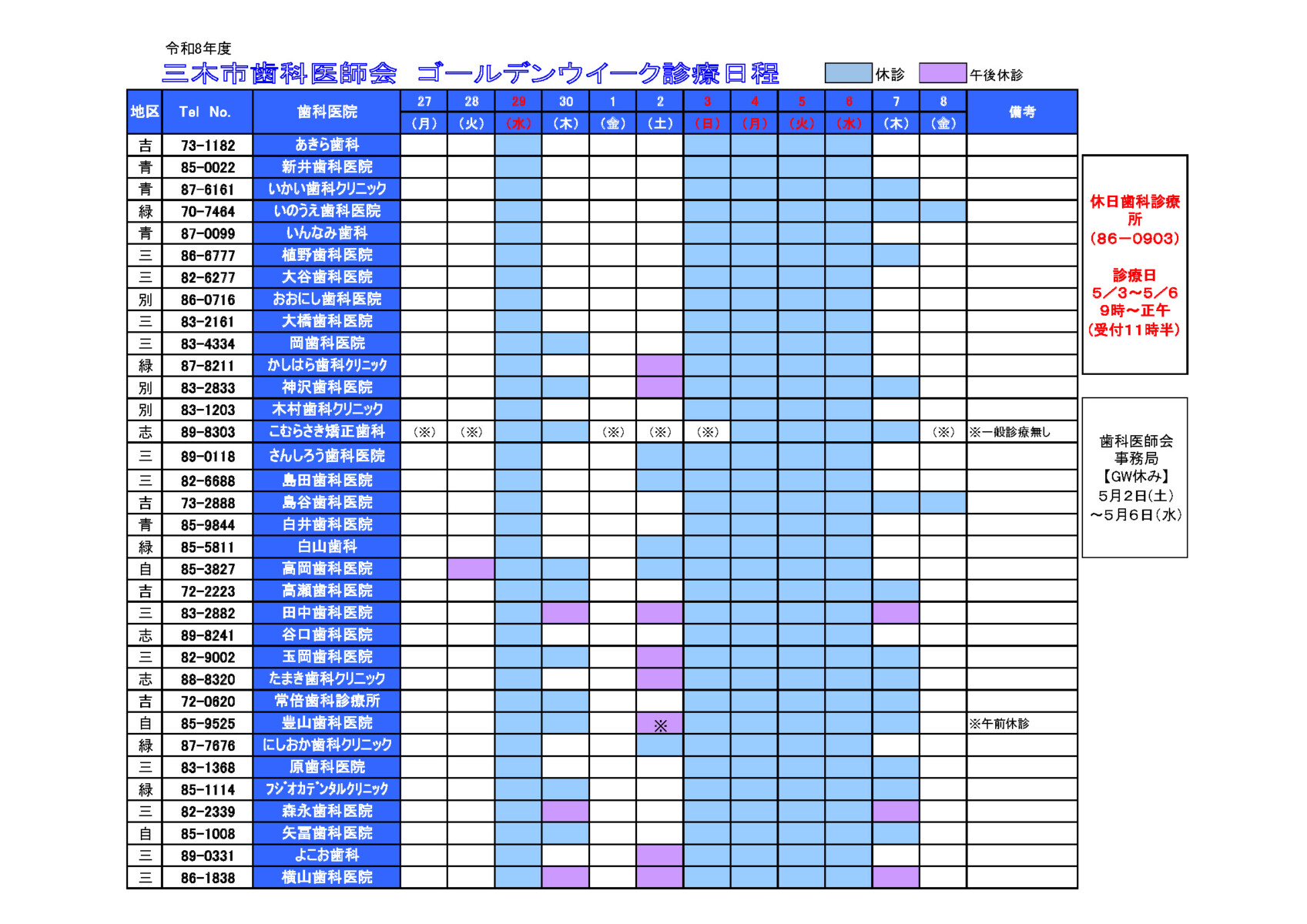 令和8年度三木市歯科医師会GWの診療日程表を公開致しました。